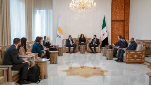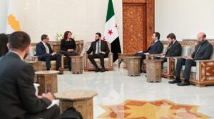 رئيس الجمهورية العربية السورية السيد أحمد الشرع ووزير الخارجية السيد أسعد الشيباني يستقبلان في دمشق وفدًا قبرصيًّا رفيع المستوى برئاسة السيد كونستاندينوس كومبوس وزير خارجية قبرص محليات On فبراير 20, 2025 Share #صحيفة_الجماهير Share FacebookTwitterGoogle+ReddItWhatsAppPinterestالبريد الإلكتروني