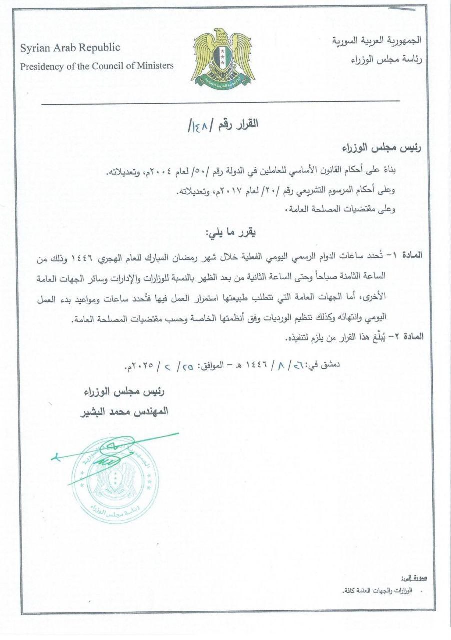 قرار بتحديد ساعات الدوام الرسمي اليومي خلال شهر رمضان المبارك للعام الهجري (1446ه) من الساعة الثامنة صباحًا وحتى الساعة الثانية بعد الظهر، بالنسبة للوزارات والإدارات وسائر الجهات العامة الأخرى، ويُستثنى من ذلك الجهات العامة التي تتطلب طبيعتها استمرار العمل فيها.