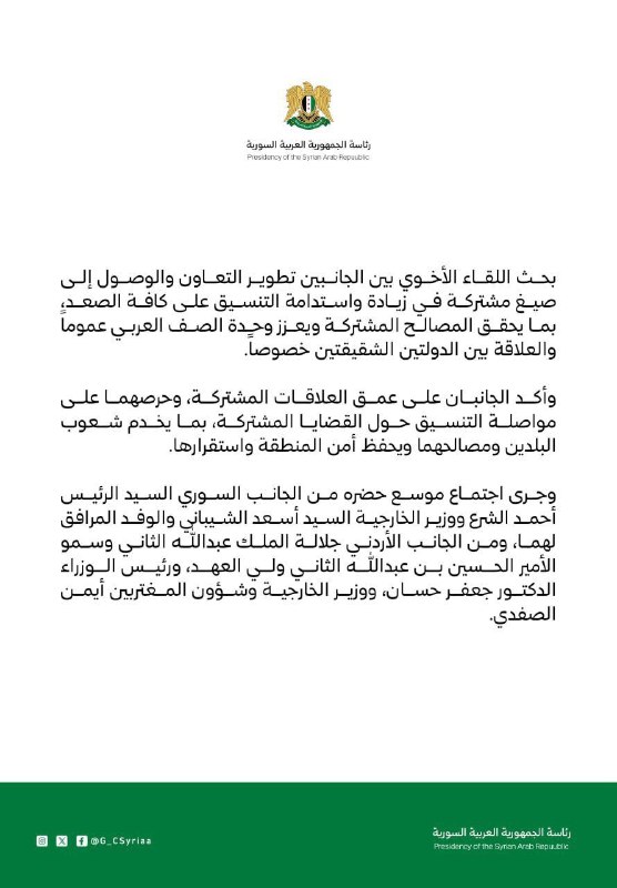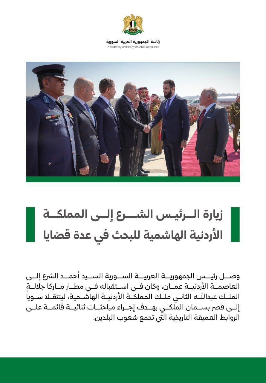 زيارة الرئيس الشرع إلى المملكة الأردنية الهاشمية للبحث في عدة قضايا محليات Last updated فبراير 26, 2025 Share #صحيفة_الجماهير Share FacebookTwitterGoogle+ReddItWhatsAppPinterestالبريد الإلكتروني