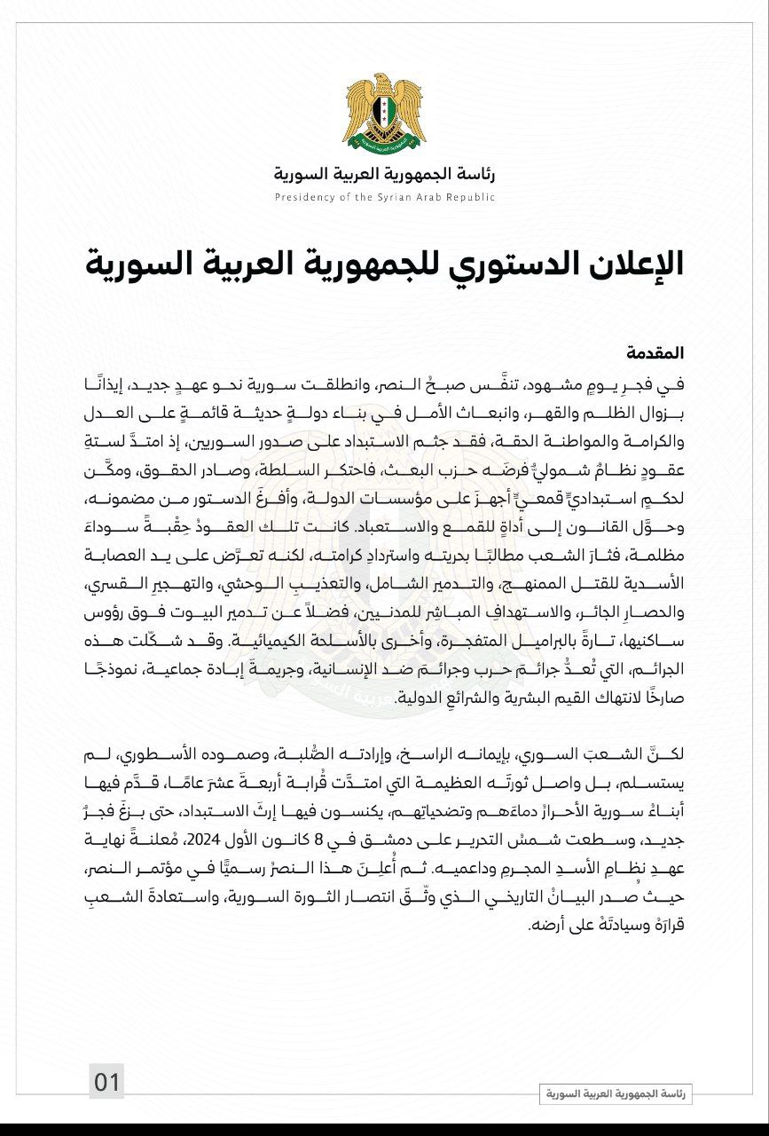 الإعلان الدستوري للجمهورية العربية السورية محليات Last updated مارس 13, 2025 Share #صحيفة_الجماهير Share FacebookTwitterGoogle+ReddItWhatsAppPinterestالبريد الإلكتروني