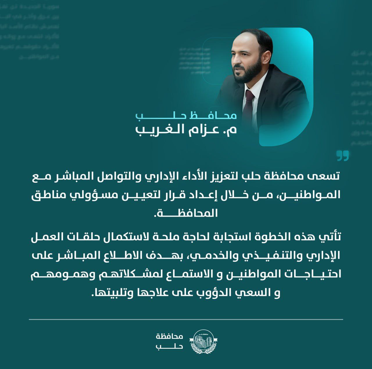 تسعى محافظة حلب لتعزيز الأداء الإداري والتواصل المباشر مع المواطنين،من خلال إعداد قرار لتعيين مسؤولي مناطق المحافظة.
