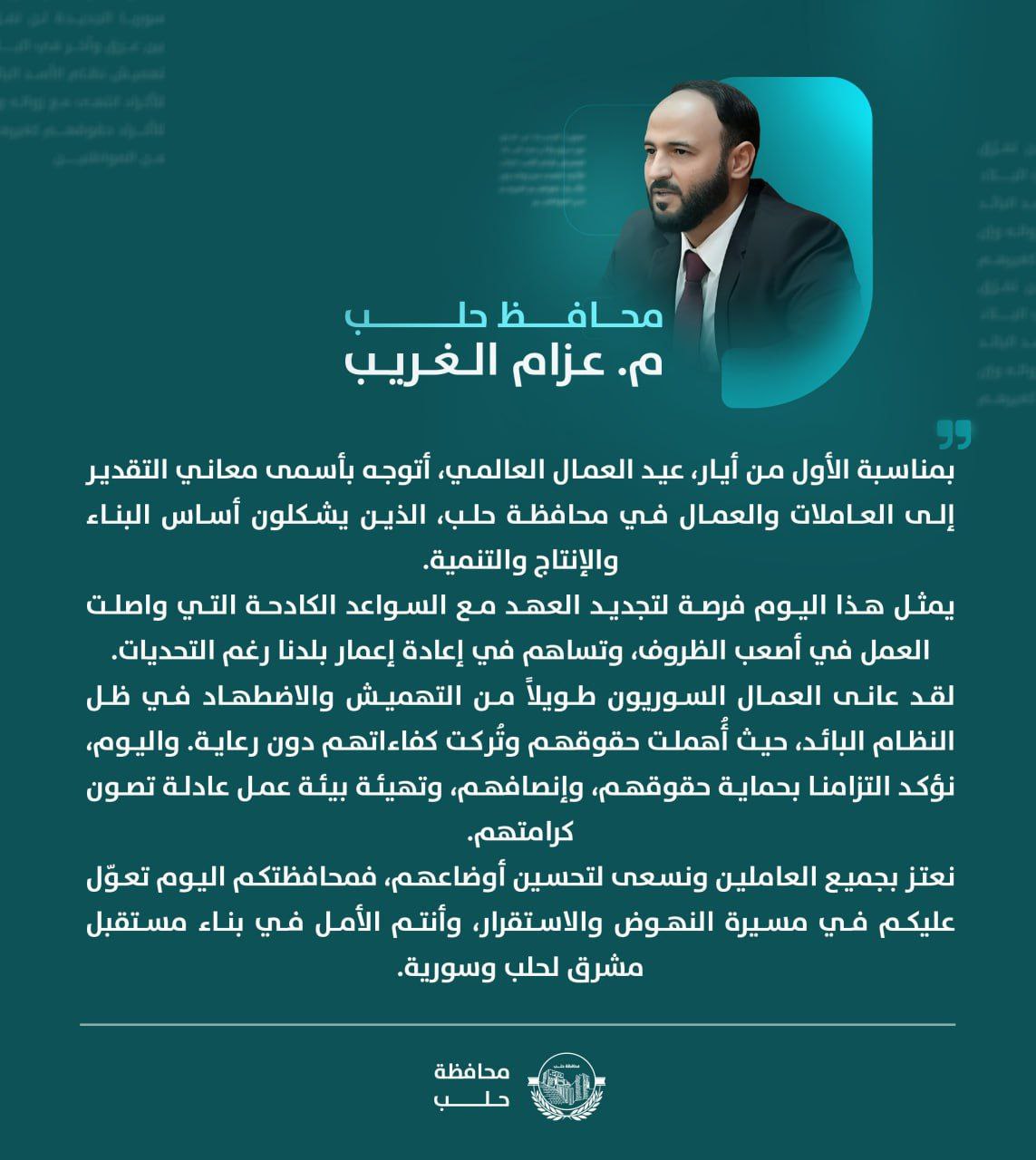 محافظ حلب المهندس عزام الغريب: بمناسبة الأول من أيار، عيد_العمال_العالمي، أتوجه بأسمى معاني التقدير إلى العاملات والعمال في محافظة_حلب، الذين يشكلون أساس البناء والإنتاج والتنمية. يمثل هذا اليوم فرصة لتجديد العهد مع السواعد الكادحة التي واصلت العمل في أصعب الظروف، وتساهم في إعادة إعمار بلدنا رغم التحديات. لقد عانى العمال السوريون طويلاً من التهميش والاضطهاد في ظل النظام البائد، حيث أُهملت حقوقهم وتُركت كفاءاتهم دون رعاية. واليوم، نؤكد التزامنا بحماية حقوقهم، وإنصافهم، وتهيئة بيئة عمل عادلة تصون كرامتهم. نعتز بجميع العاملين ونسعى لتحسين أوضاعهم، فمحافظتكم اليوم تعوّل عليكم في مسيرة النهوض والاستقرار، وأنتم الأمل في بناء مستقبل مشرق لحلب وسورية.