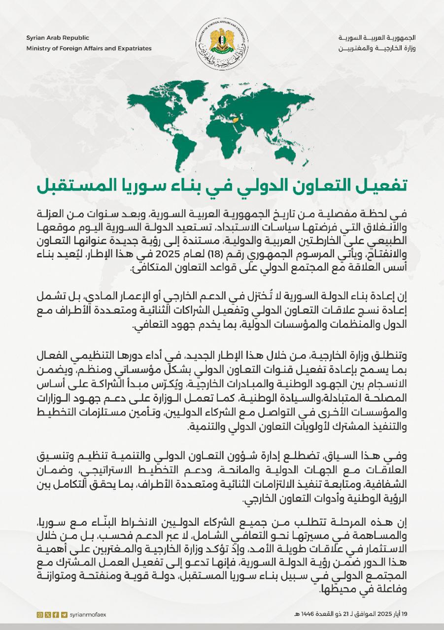 وزارة الخارجية والمغتربين توضح رؤيتها حول تفعيل التعاون الدولي في بناء سوريا المستقبل. محليات On مايو 19, 2025 Share #صحيفة_الجماهير Share FacebookTwitterGoogle+ReddItWhatsAppPinterestالبريد الإلكتروني