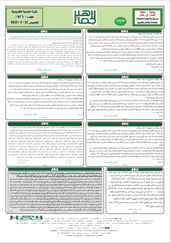 إعلانات الجماهير نشرة إعلانية الكترونية العدد رقم /726/ ليوم الخميس 22 – 5 – 2025 اعلانات Last updated مايو 21, 2025 Share Loading... Taking too long? Reload document | Open in new tab Share FacebookTwitterGoogle+ReddItWhatsAppPinterestالبريد الإلكتروني