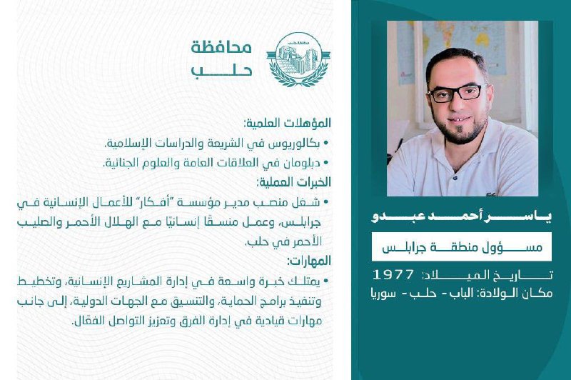 محافظ حلب يعين الأستاذ ياسر أحمد عبدو مسؤولاً عن منطقة جرابلس بريف حلب الشرقي. محليات On مايو 28, 2025 Share #صحيفة_الجماهير Share FacebookTwitterGoogle+ReddItWhatsAppPinterestالبريد الإلكتروني
