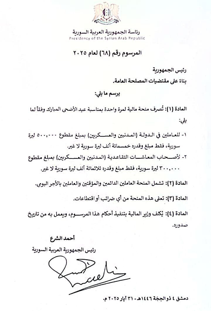 رئيس الجمهورية السيد أحمد الشرع يصدر مرسوماً بمنحة مالية قدرها 500 ألف ليرة سورية لمرة واحدة، للعاملين في الدولة، وللمتقاعدين 300 ألف ليرة سورية لمرة واحدة. محليات On يونيو 1, 2025 Share #صحيفة_الجماهير Share FacebookTwitterGoogle+ReddItWhatsAppPinterestالبريد الإلكتروني