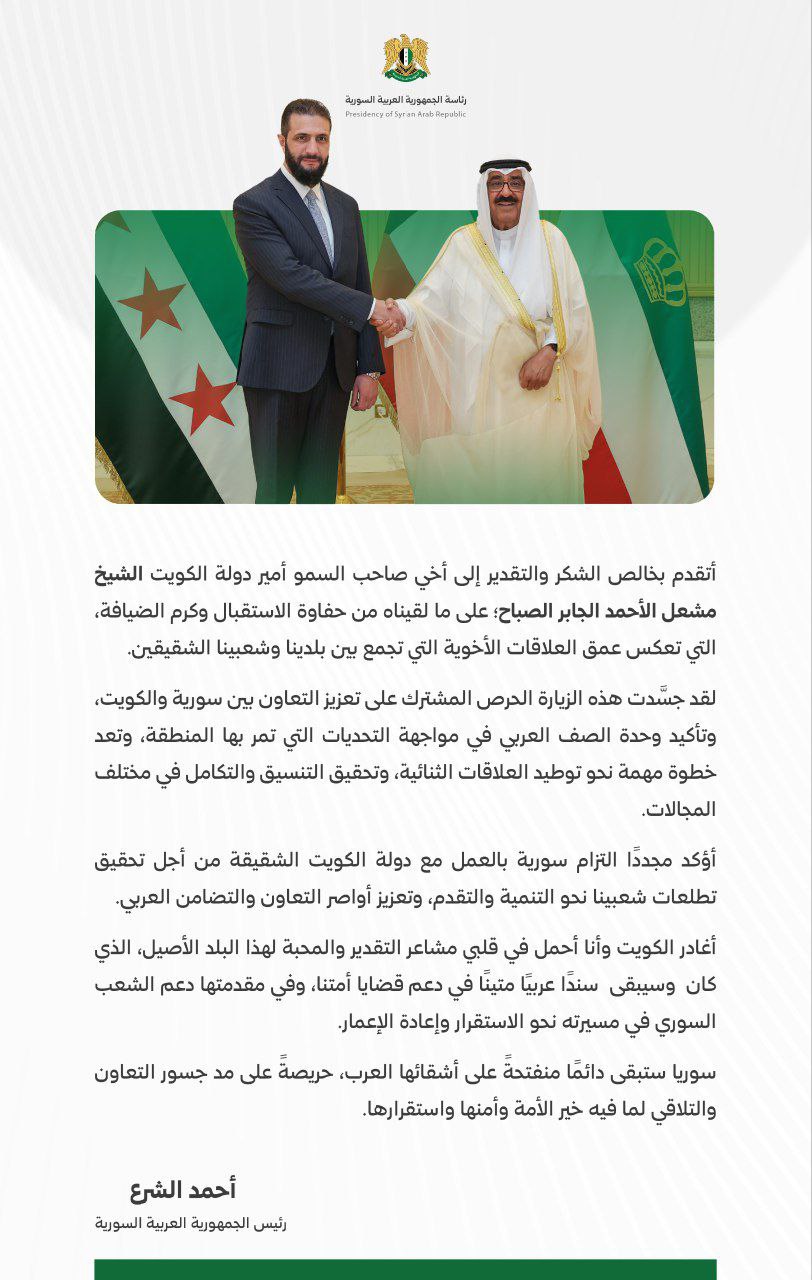 فخامة رئيس الجمهورية العربية السورية، السيد أحمد الشرع، يتوجه برسالة شكر إلى سمو أمير دولة الكويت الشيخ مشعل الأحمد الجابر الصباح. خدمي On يونيو 1, 2025 Share #صحيفة_الجماهير Share FacebookTwitterGoogle+ReddItWhatsAppPinterestالبريد الإلكتروني