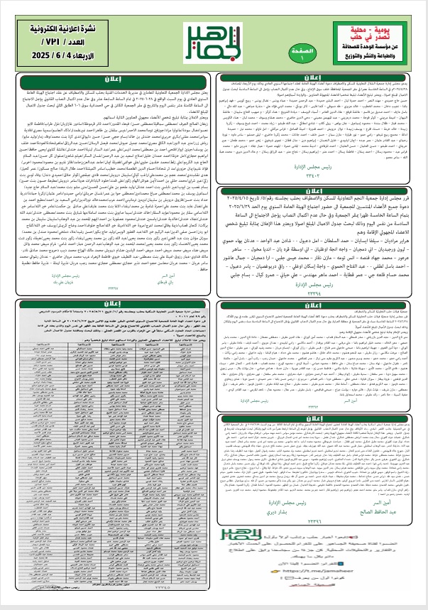 إعلانات الجماهير نشرة إعلانية الكترونية العدد رقم /731/ ليوم الأربعاء 4 – 6 – 2025 اعلانات Last updated يونيو 3, 2025 Share Loading... Taking too long? Reload document | Open in new tab Share FacebookTwitterGoogle+ReddItWhatsAppPinterestالبريد الإلكتروني
