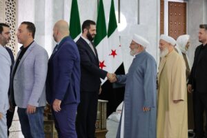 السيد الرئيس أحمد الشرع يتبادل تهاني عيد الأضحى المبارك مع عدد من الأهالي والمسؤولين في قصر الشعب بالعاصمة دمشق. محليات On يونيو 6, 2025 Share #صحيفة_الجماهير Share FacebookTwitterGoogle+ReddItWhatsAppPinterestالبريد الإلكتروني