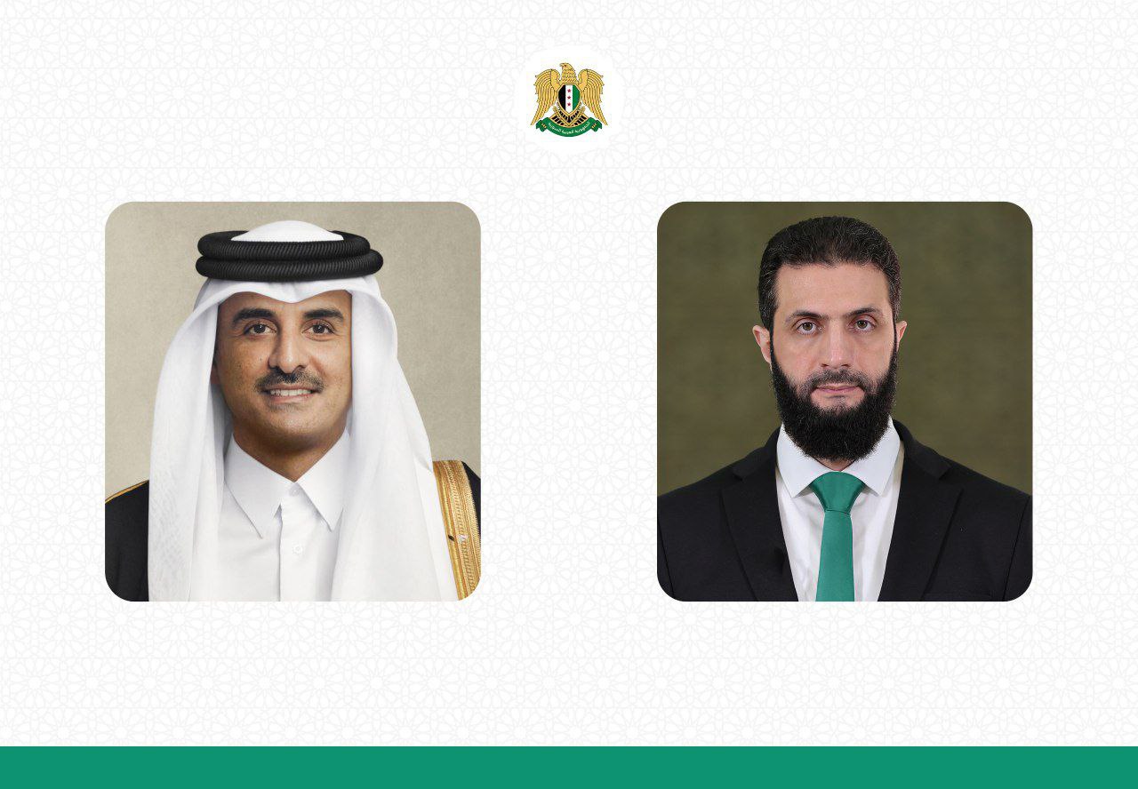 أجرى رئيس الجمهورية العربية السورية، السيد أحمد الشرع، اتصالاً هاتفياً مع الشيخ تميم بن حمد آل ثاني، أمير دولة قطر، لتهنئته بمناسبة عيد الأضحى المبارك، متمنياً لقطر دوام الأمن والاستقرار والازدهار.