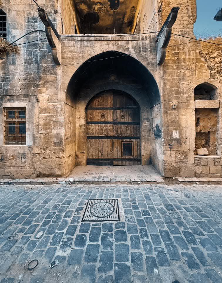 جمعتكم مباركة 🕌 💚 بوابة خشبية صامدة، وتفاصيل فريدة من واجهة خان القاضي التاريخي في باب قنسرين، في حلب القديمة.