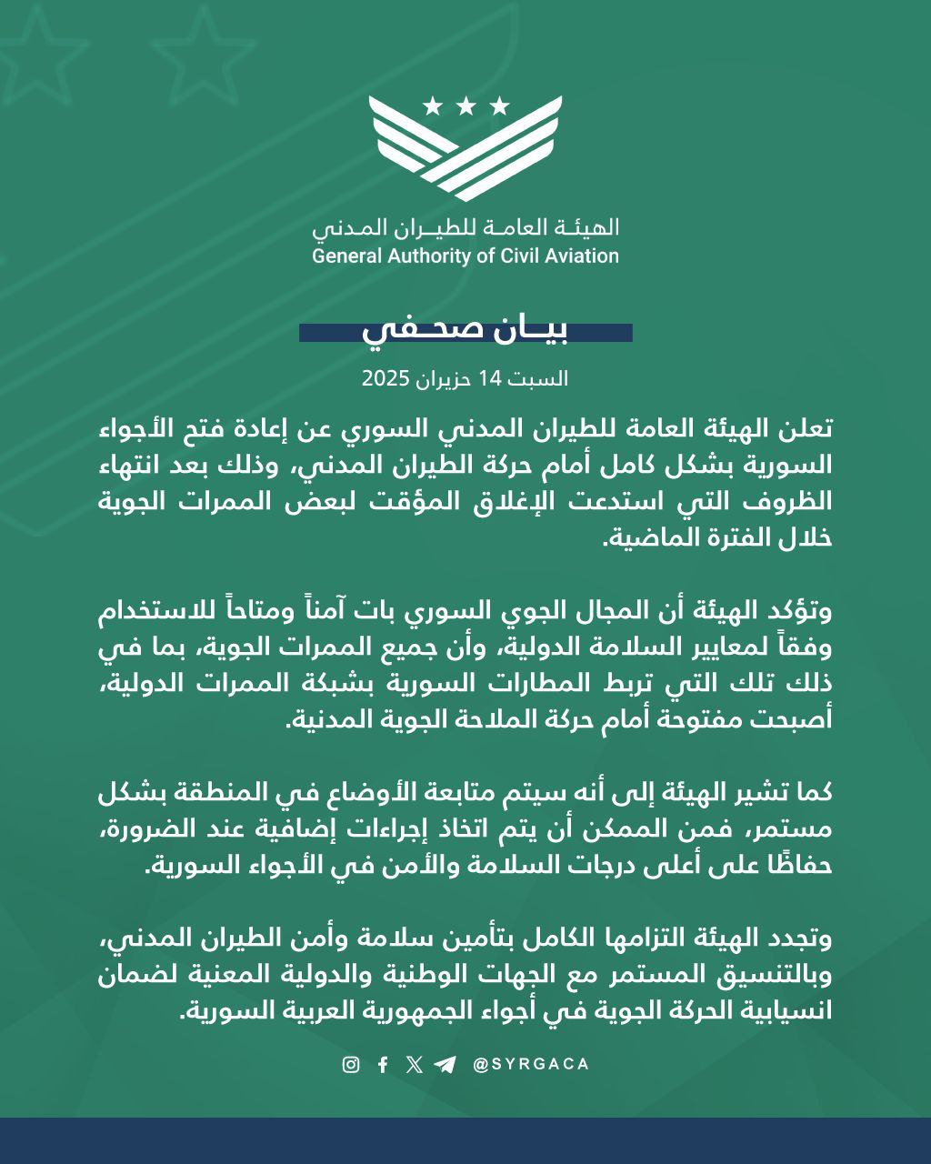 استئناف كامل حركة الطيران في الأجواء السورية محليات On يونيو 14, 2025 Share أعلنت الهيئة العامة للطيران المدني السوري عن إعادة فتح الأجواء السورية بشكل كامل أمام حركة الطيران المدني، مؤكدة أن المجال الجوي أصبح آمناً ومتاحاً للاستخدام وفقاً للمعايير الدولية. #صحيفة_الجماهير Share FacebookTwitterGoogle+ReddItWhatsAppPinterestالبريد الإلكتروني