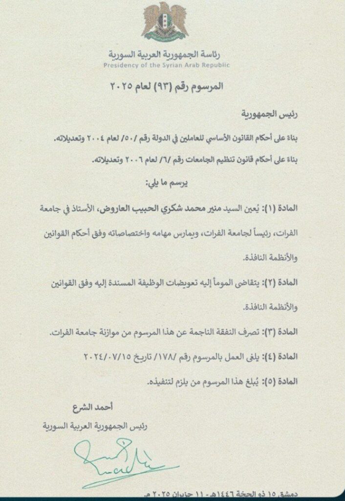 المرسوم رقم (93) لعام 2025 القاضي بتعيين الأستاذ في جامعة الفرات منير محمد شكري الحبيب العاروض رئيساً لجامعة الفرات ويمارس مهامه واختصاصاته وفق أحكام القوانين والأنظمة النافذة.