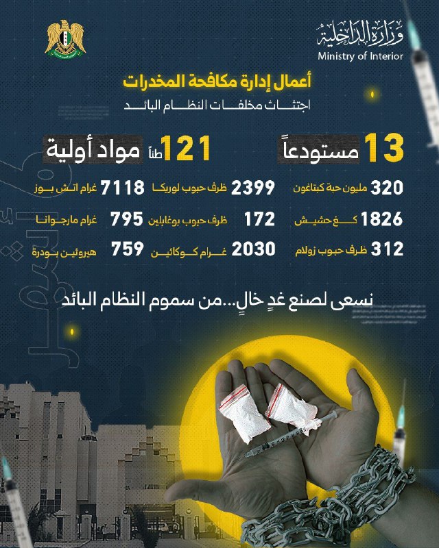 في اليوم العالمي لمكافحة المخدرات تستعرض إدارة مكافحة المخدرات في وزارة الداخلية جهودها في مواجهة هذه الآفة الخطيرة، بعد أن حوّل النظام البائد سوريا إلى بؤرة لتصنيع وتهريب المخدرات على مستوى العالم، وتُنشر في هذه المناسبة إحصائية شاملة لعمل الإدارة منذ سقوط النظام وحتى اليوم، تكشف حجم التحدي والاستجابة الأمنية المستمرة في التصدي لتجارة السموم