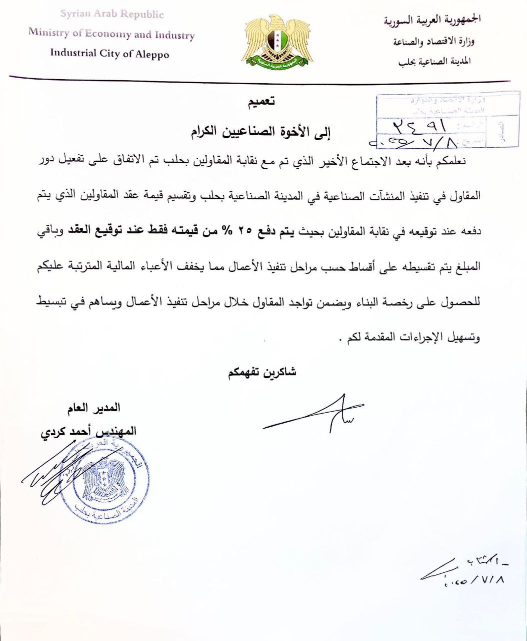 في خطوة تهدف إلى دعم القطاع الصناعي وتسهيل عمليات البناء، تم التوصل إلى اتفاق بين نقابة المقاولين بحلب والمدينة الصناعية لتفعيل دور المقاولين في تنفيذ المنشآت الصناعية داخل المدينة الصناعية بحلب.