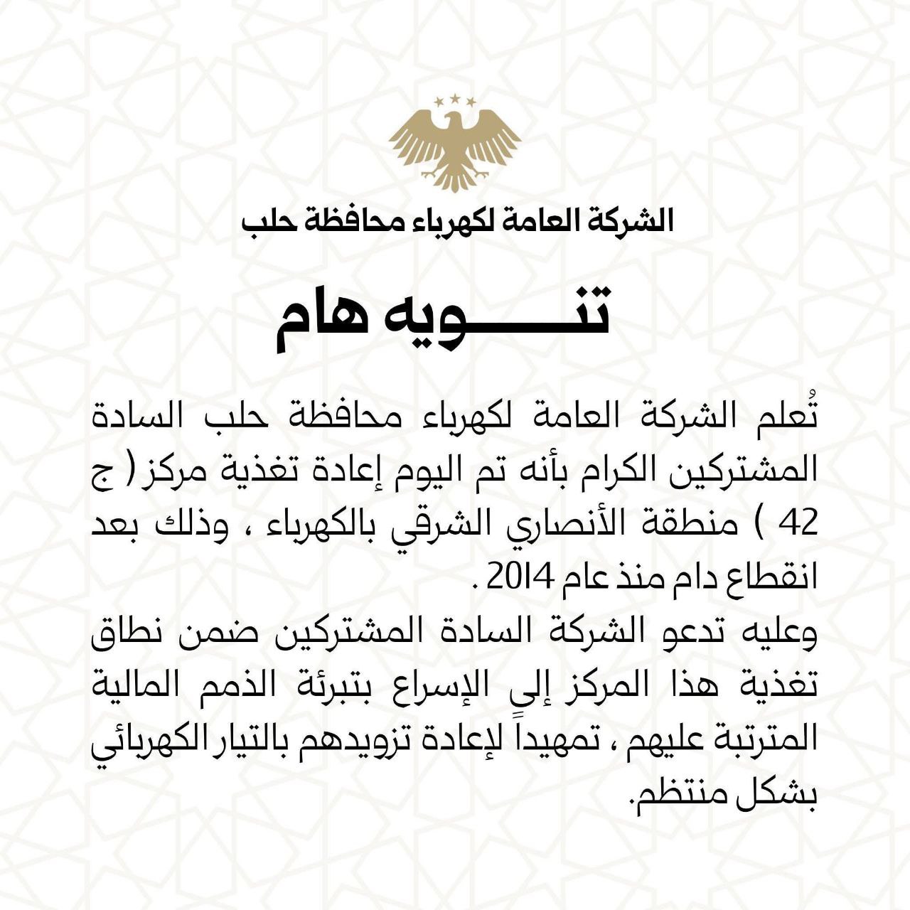 ⭕️ تنويه هام من الشركة العامة لكهرباء محافظة حلب خدمي On يوليو 17, 2025 Share #صحيفة_الجماهير Share FacebookTwitterGoogle+ReddItWhatsAppPinterestالبريد الإلكتروني