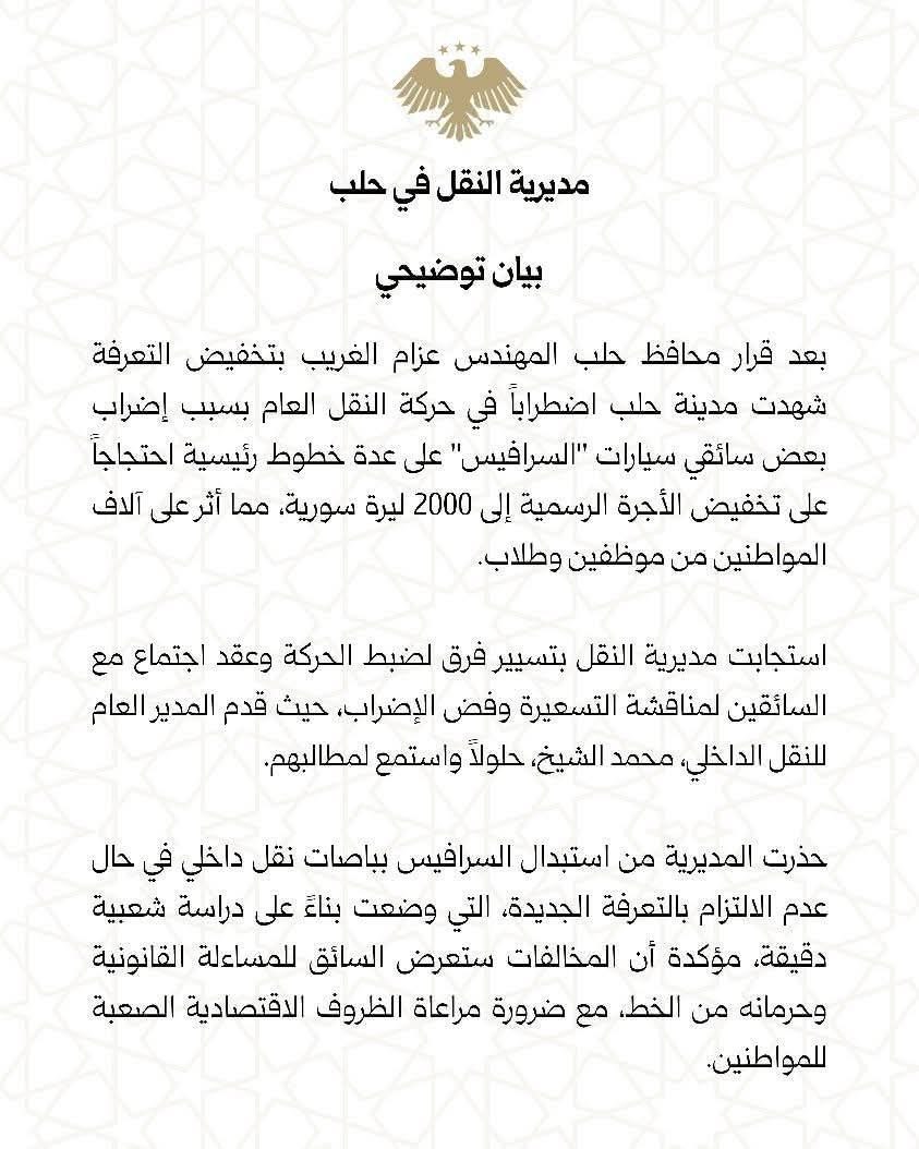 بيان توضيحي من مديرية النقل في محافظة حلب حول إضراب بعض سائقي السيارات “السيرفيسات” عقب تغيير تعرفة النقل داخل المدينة محليات On يوليو 20, 2025 Share #صحيفة_الجماهير Share FacebookTwitterGoogle+ReddItWhatsAppPinterestالبريد الإلكتروني