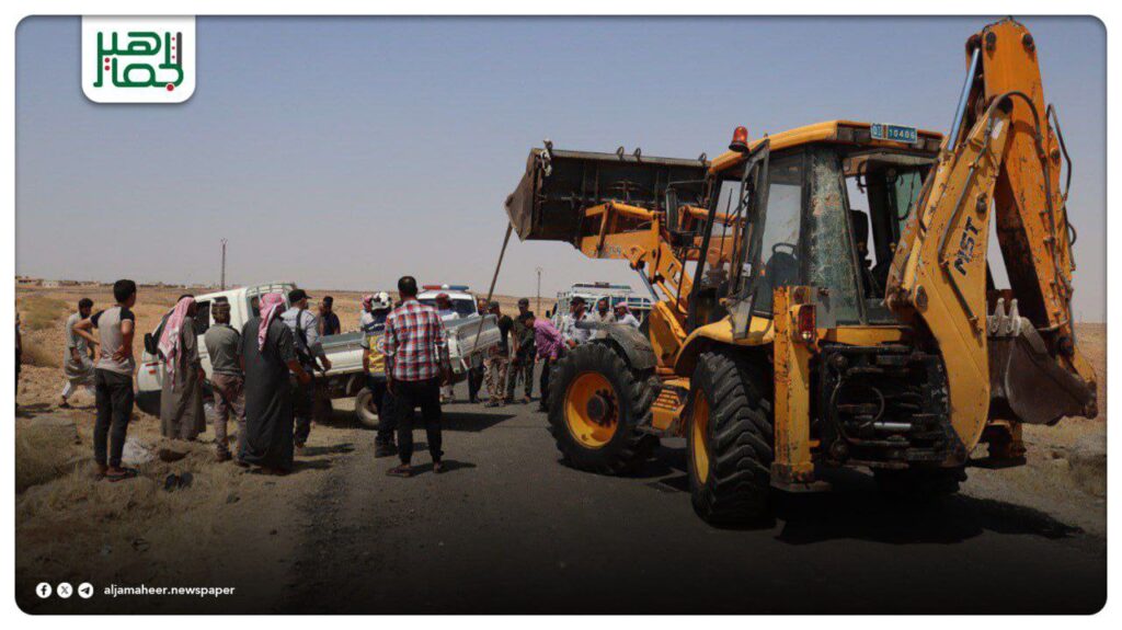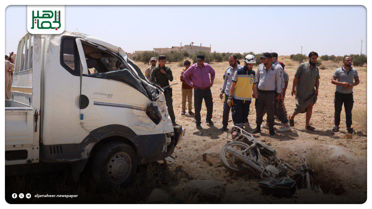 حيث تصادمت سيارة ودراجة نارية كانا يستقلانها، واستلم فريق الإسعاف في الدفاع المدني السوري المصاب والجثة من سيارة مدنية كانت تقلهم، وقاموا بنقلهما فورًا إلى المشفى، حيث أكدت الفرق وفاة الرجل. كما قام الفريق بتأمين مكان الحادث وفتح الطريق بمساعدة المدنيين.