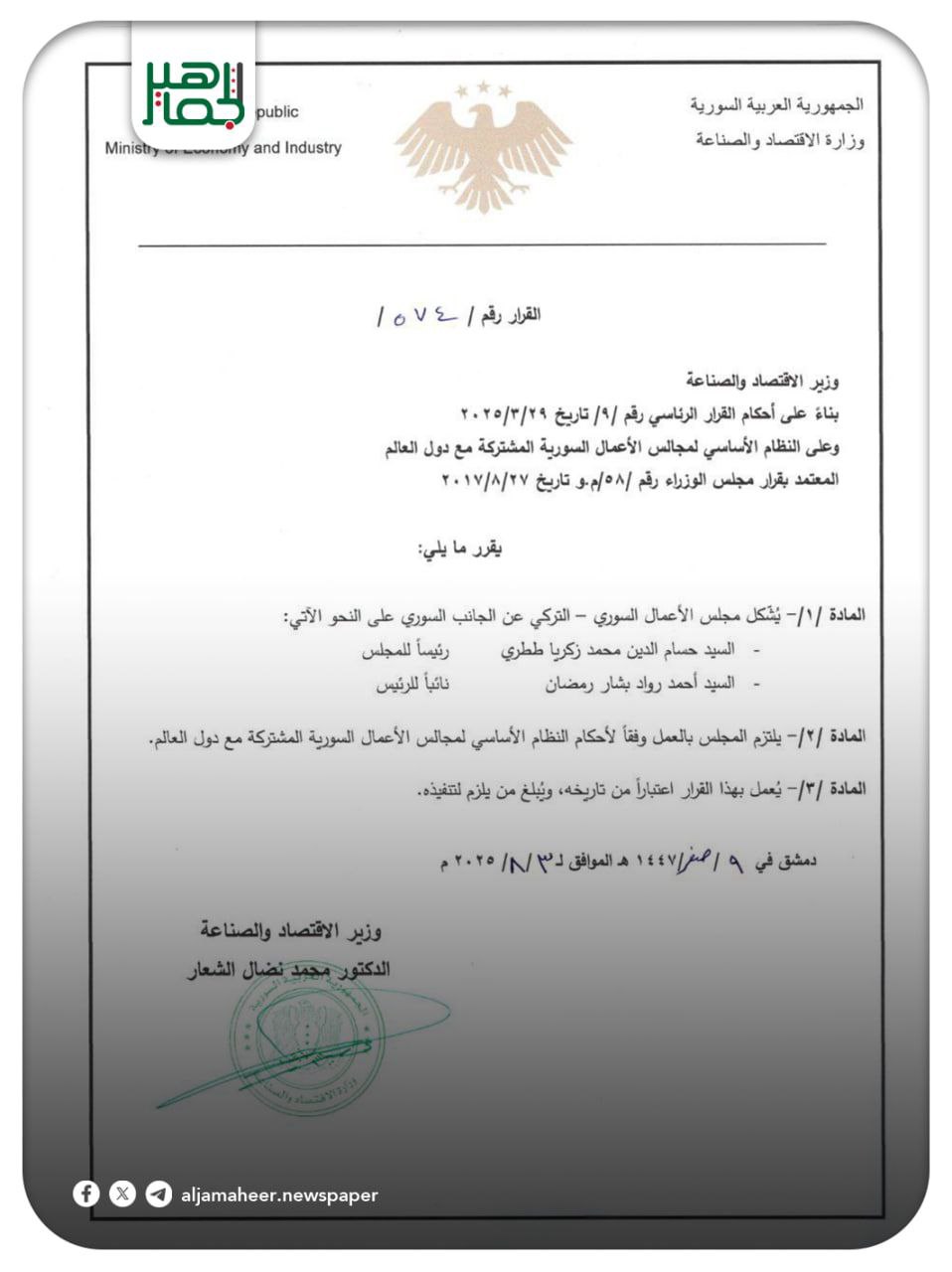 أصدرت وزارة الاقتصاد والصناعة قراراً بتشكيل مجلس الأعمال السوري-التركي يهدف المجلس إلى تعزيز التعاون الاقتصادي والتجاري بما يخدم مصالح البلدين خدمي On أغسطس 3, 2025 Share Share FacebookTwitterGoogle+ReddItWhatsAppPinterestالبريد الإلكتروني
