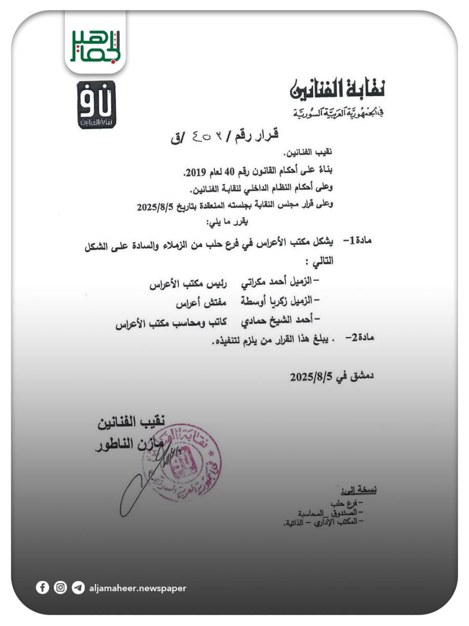 نقابة الفنانين تصدر القرار 452/ق والخاص بتشكيل مكتب الأعراس في فرع حلب، برئاسة أحمد مكاراتي و زكريا أوسطة مفتش أعراس، و أحمد الشيخ حمادي كاتب ومحاسب مكتب الأعراس. أحدث الأخبار On أغسطس 9, 2025 Share Share FacebookTwitterGoogle+ReddItWhatsAppPinterestالبريد الإلكتروني