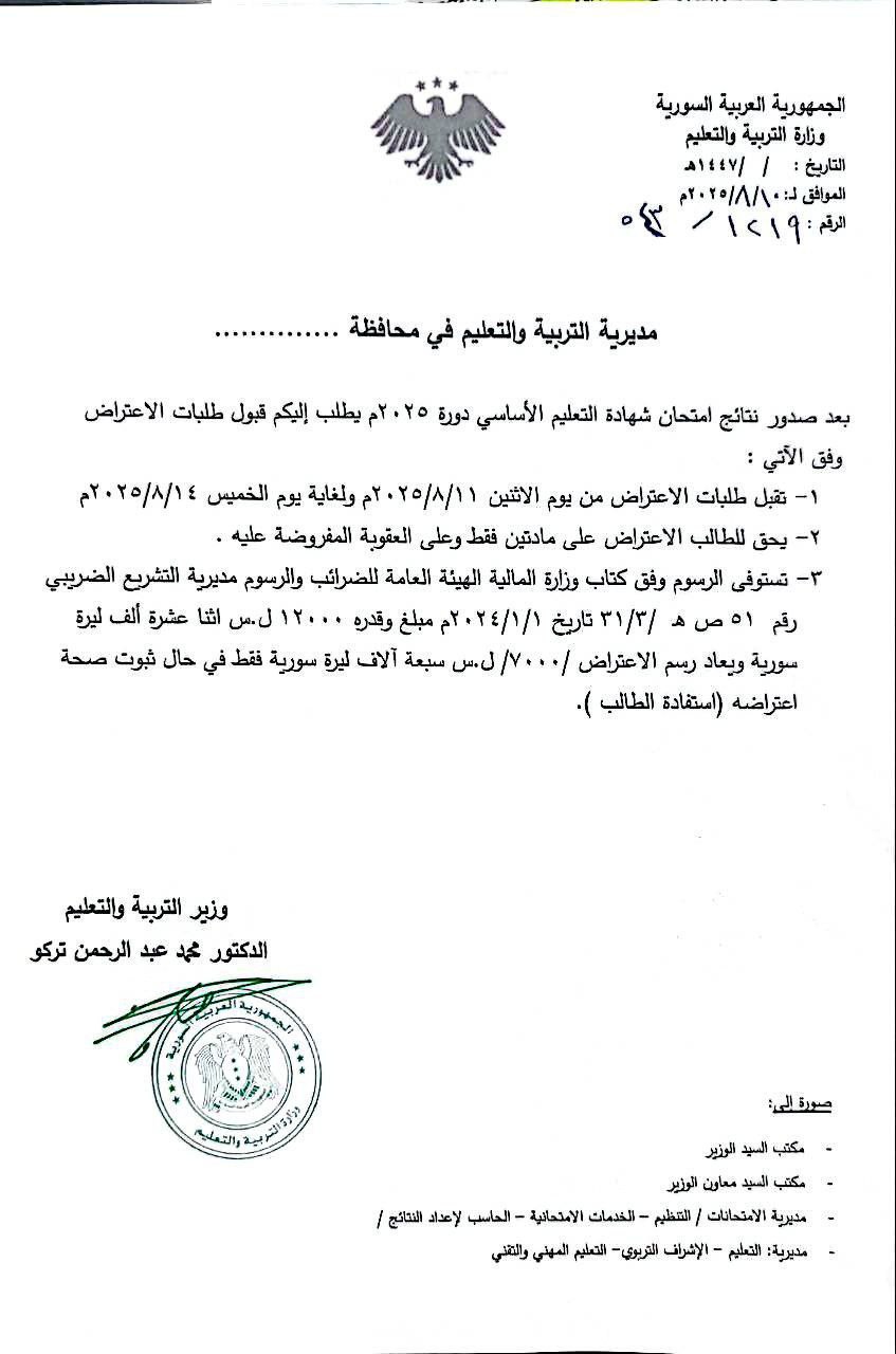 بدء قبول طلبات الاعتراض على نتائج مواد شهادة التعليم الأساسي اعتباراً من يوم غد الإثنين ولغاية يوم الخميس المقبل، وذلك في مديريات التربية في المحافظات