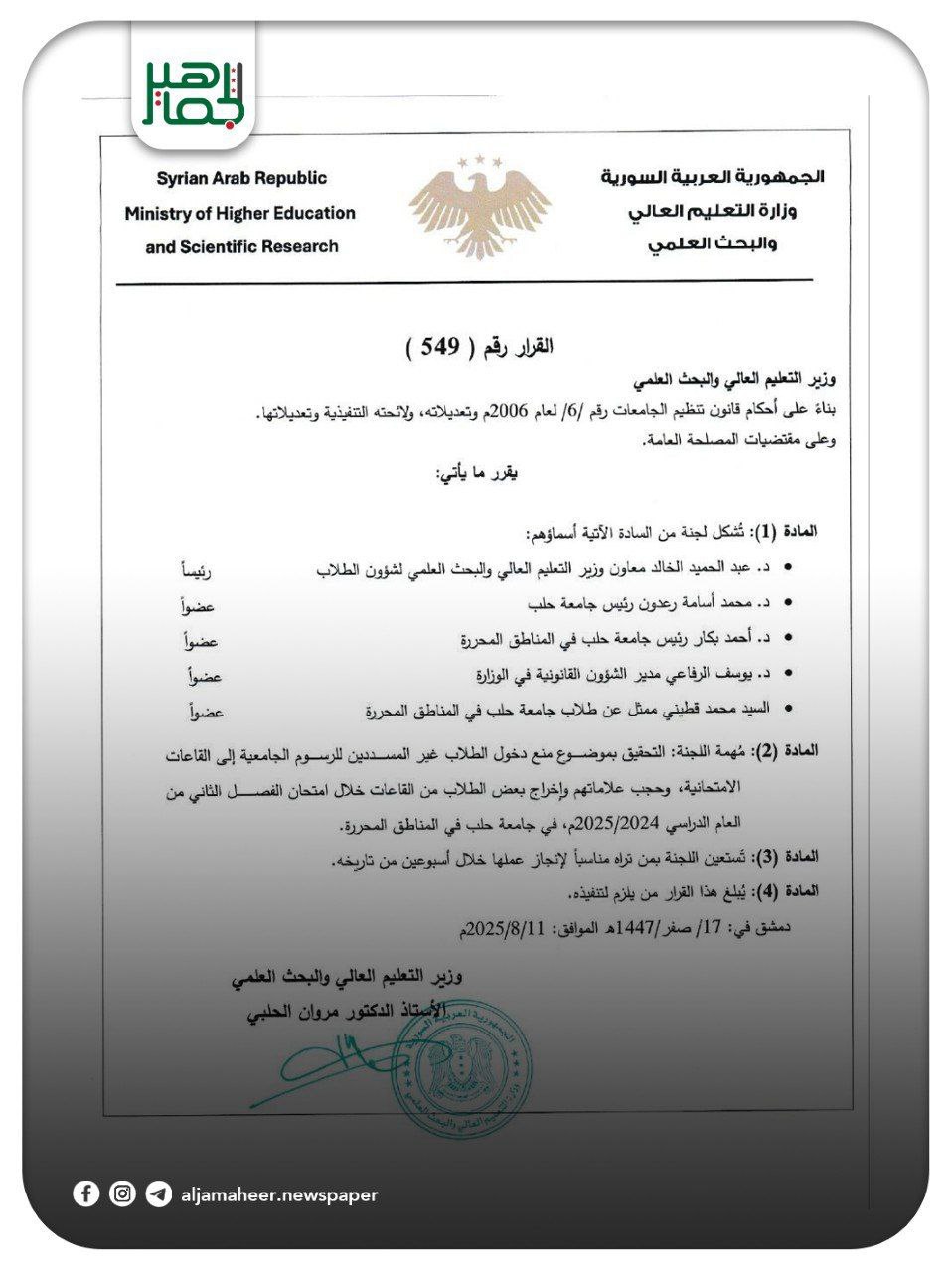 وزير التعليم العالي يصدر قرارًا بتشكيل لجنة مهمتها التحقيق بموضوع منع دخول الطلاب غير المسددين للرسوم الجامعية إلى القاعات الامتحانية في جامعة حلب بالمناطق المحررة. أحدث الأخبار On أغسطس 12, 2025 Share Share FacebookTwitterGoogle+ReddItWhatsAppPinterestالبريد الإلكتروني