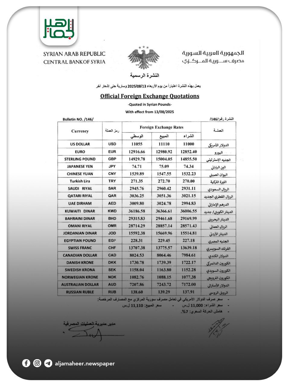 سعر صرف الليرة السورية مقابل العملات الأجنبية والعربية بحسب النشرة الرسمية من مصرف سوريا المركزي بتاريخ 13/ 08/ 2025 اقتصاد On أغسطس 13, 2025 Share #صحيفة_الجماهير Share FacebookTwitterGoogle+ReddItWhatsAppPinterestالبريد الإلكتروني