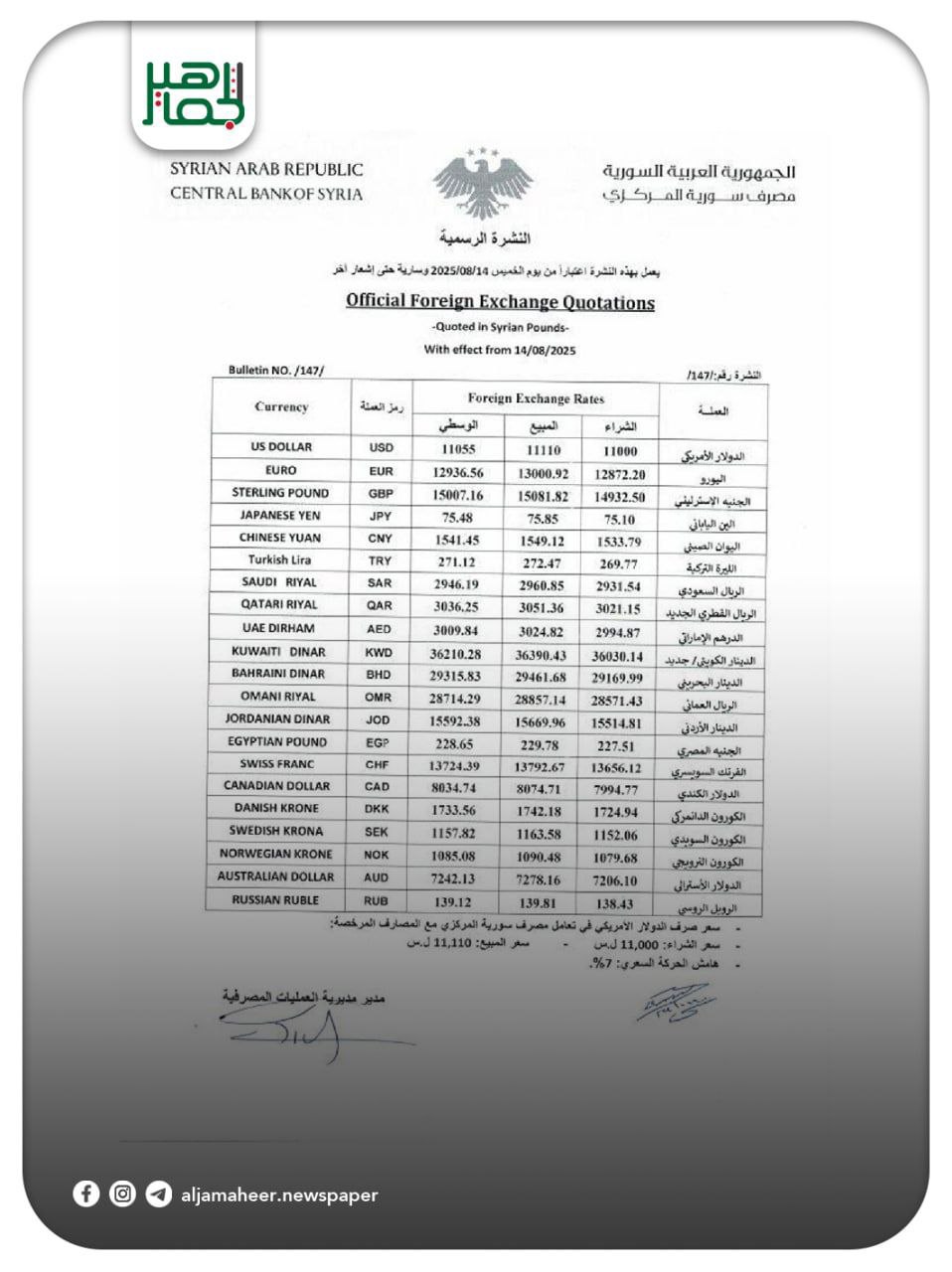 سعر صرف الليرة السورية مقابل العملات الأجنبية والعربية بحسب النشرة الرسمية من مصرف سوريا المركزي بتاريخ 14/ 08/ 2025 محليات On أغسطس 14, 2025 Share #صحيفة_الجماهير Share FacebookTwitterGoogle+ReddItWhatsAppPinterestالبريد الإلكتروني