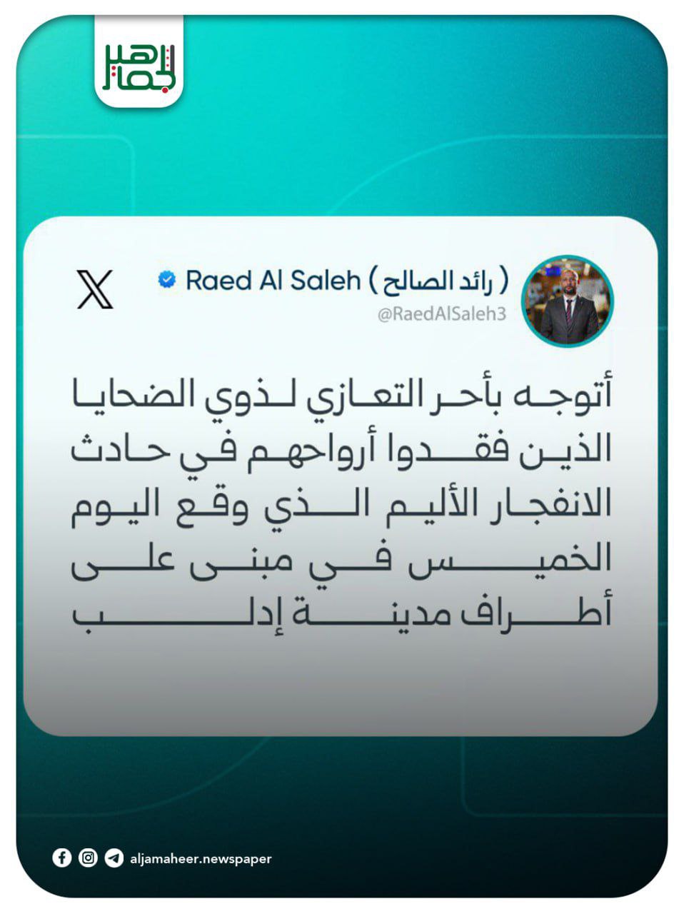 رائد الصالح وزير الطوارئ و إدارة الكوارث عبر منصة X: أتوجه بأحر التعازي لذوي الضحايا الذين فقدوا أرواحهم في حادث الانفجار الأليم الذي وقع اليوم الخميس 14 آب في مبنى على أطراف مدينة إدلب