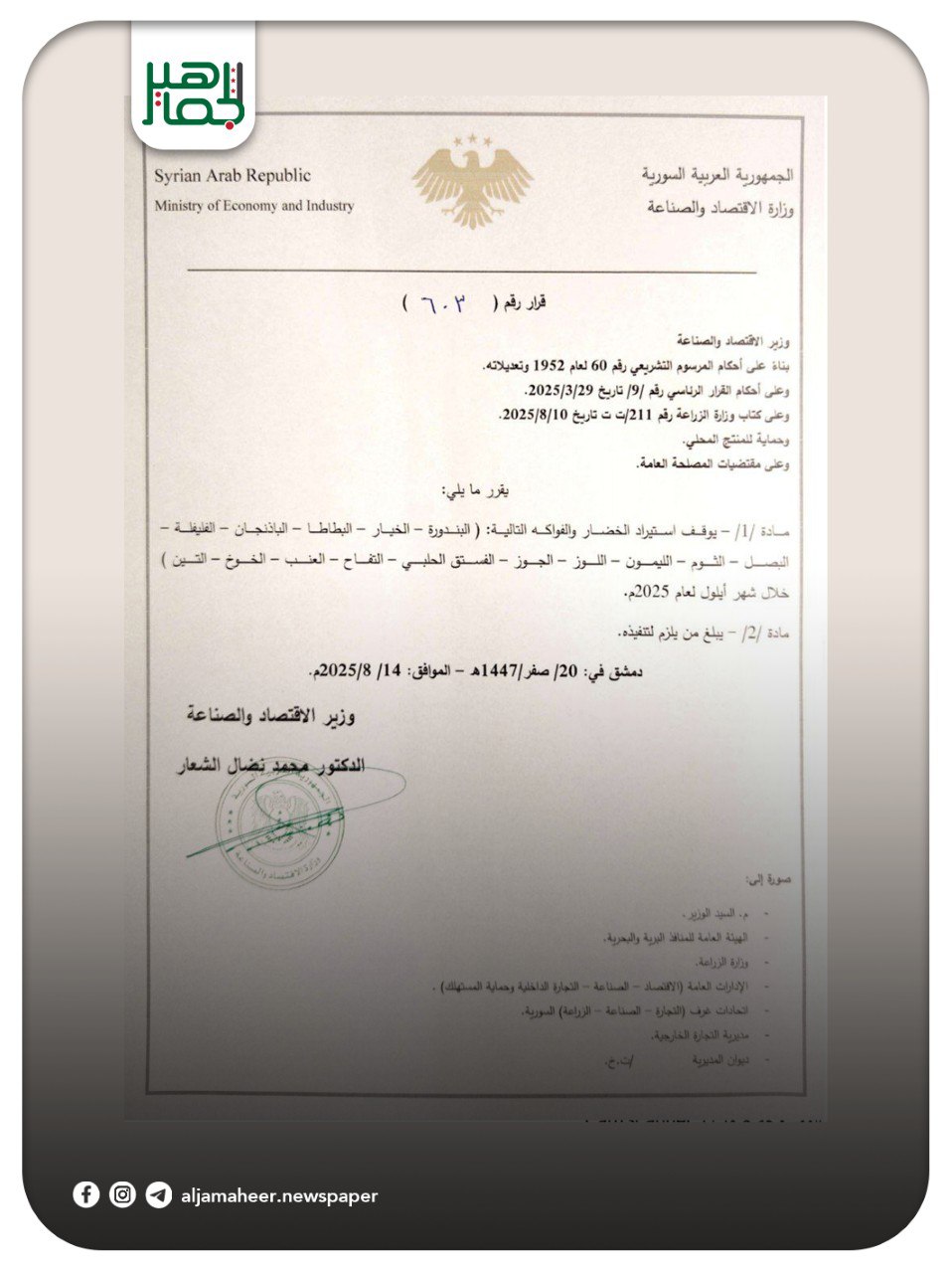 أصدرت وزارة الاقتصاد والصناعة قراراً بإيقاف استيراد عدد من أصناف الخضار خلال شهر أيلول خدمي On أغسطس 14, 2025 Share Share FacebookTwitterGoogle+ReddItWhatsAppPinterestالبريد الإلكتروني