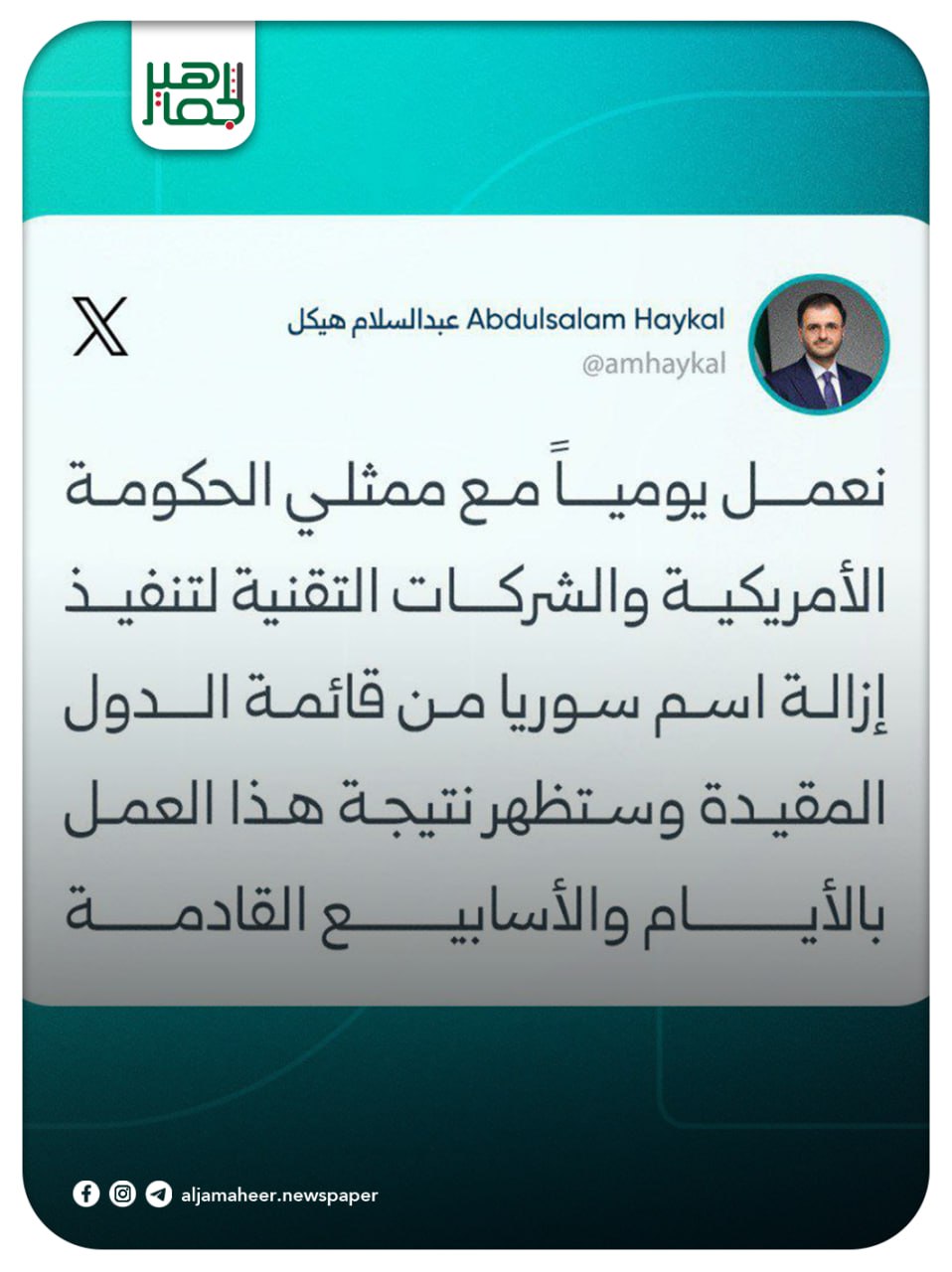 📌 فريق الوزارة يعمل يومياً مع ممثلي الحكومة الأمريكية ومع الشركات التقنية هناك لتنفيذ إزالة اسم سوريا من قائمة الدول المقيدة