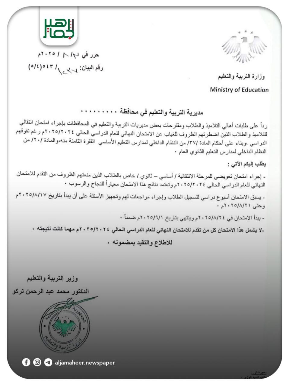 📌إجراء امتحان تعويضي للمرحلة الانتقالية (أساسي-ثانوي) خاص بالطلاب الذين منعتهم الظروف من التقدم لامتحاناتهم النهائية دورة العام الدراسي الحالي، وتكون نتائج هذا الامتحان معياراً للنجاح والرسوب.