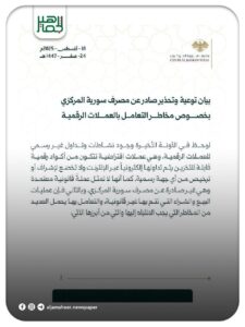 📌يحذر المصرف المواطنين من التداول بالعملات الرقمية كونها غير مرخصة ولم تصدر من المصرف.