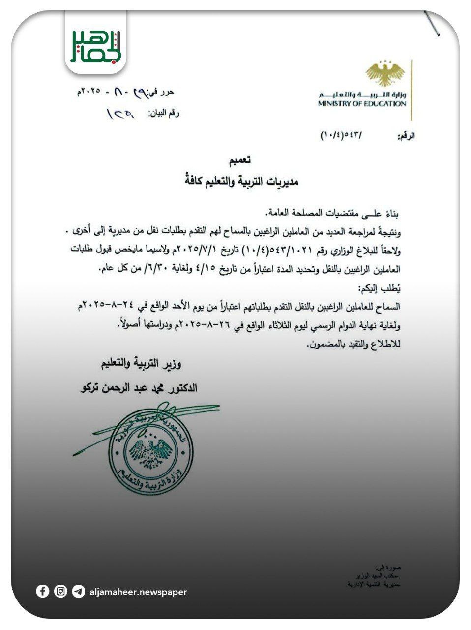 وزارة التربية والتعليم: فتح باب النقل الخارجي للعاملين من مديرية إلى أخرى خدمي On أغسطس 19, 2025 Share 📌 السماح للعاملين الراغبين بالنقل بالتقدم بطلباتهم اعتباراً من يوم الأحد الواقع في 2025/8/24 لغاية نهاية الدوام الرسمي ليوم الثلاثاء الواقع في 2025/8/26 وبدون استثناء Share FacebookTwitterGoogle+ReddItWhatsAppPinterestالبريد الإلكتروني