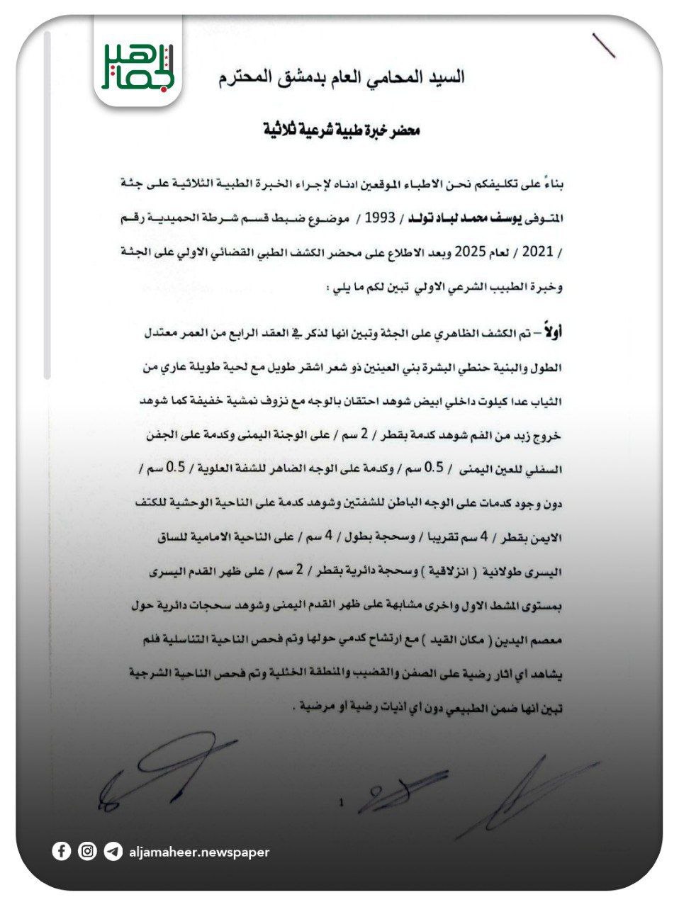 المحامي العام بدمشق يتسلم تقريراً من الطبيب الشرعي حول واقعة وفاة الشاب يوسف لباد. أحدث الأخبار On أغسطس 19, 2025 Share Share FacebookTwitterGoogle+ReddItWhatsAppPinterestالبريد الإلكتروني