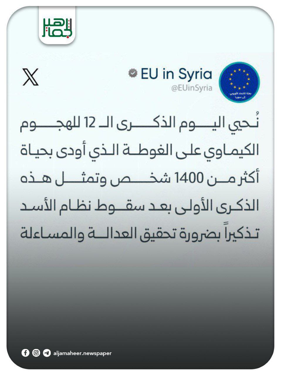 📌نُحيي اليوم الذكرى الـ 12 للهجوم الكيماوي على الغوطة الذي أودى بحياة أكثر من 1400 شخص