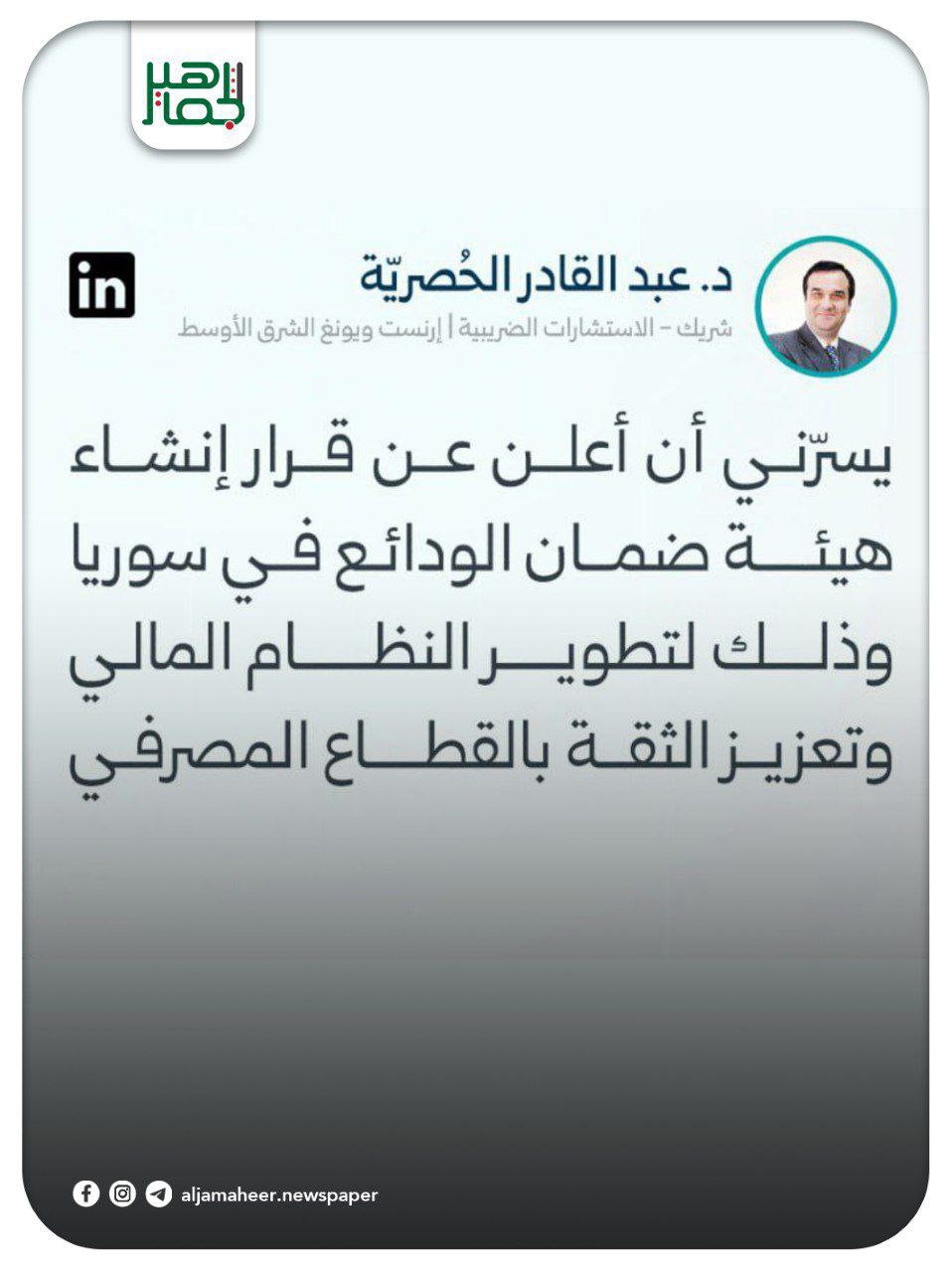 حاكم مصرف سورية المركزي عبد القادر حصرية يعلن عن إنشاء هيئة ضمان الودائع في منشور له عبر منصة لينكد إن: