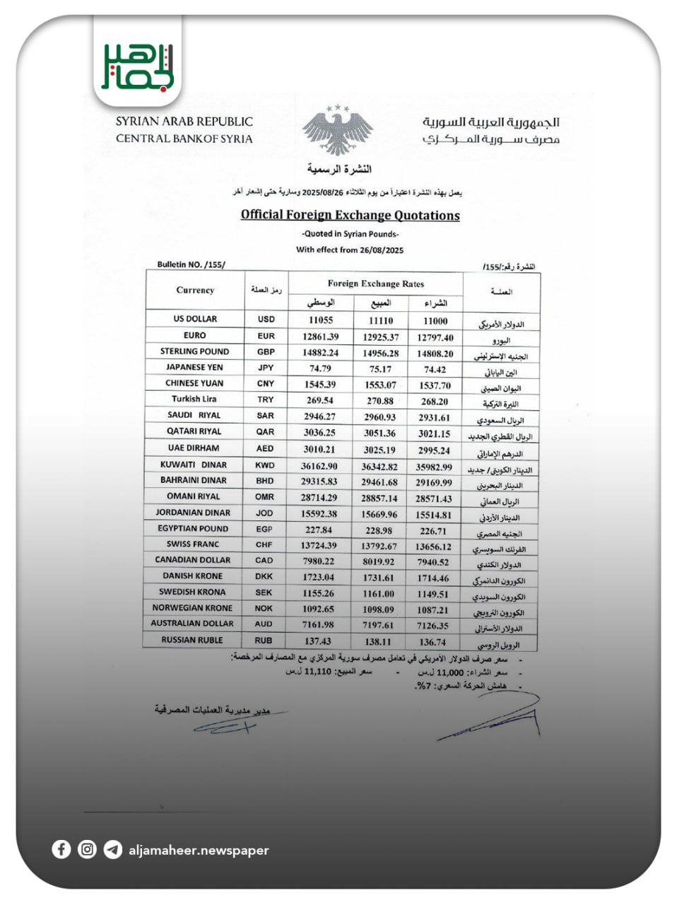 سعر صرف الليرة السورية مقابل العملات الأجنبية والعربية بحسب النشرة الرسمية من مصرف سورية المركزي بتاريخ 26/ 08/ 2025 اقتصاد On أغسطس 26, 2025 Share #صحيفة_الجماهير Share FacebookTwitterGoogle+ReddItWhatsAppPinterestالبريد الإلكتروني