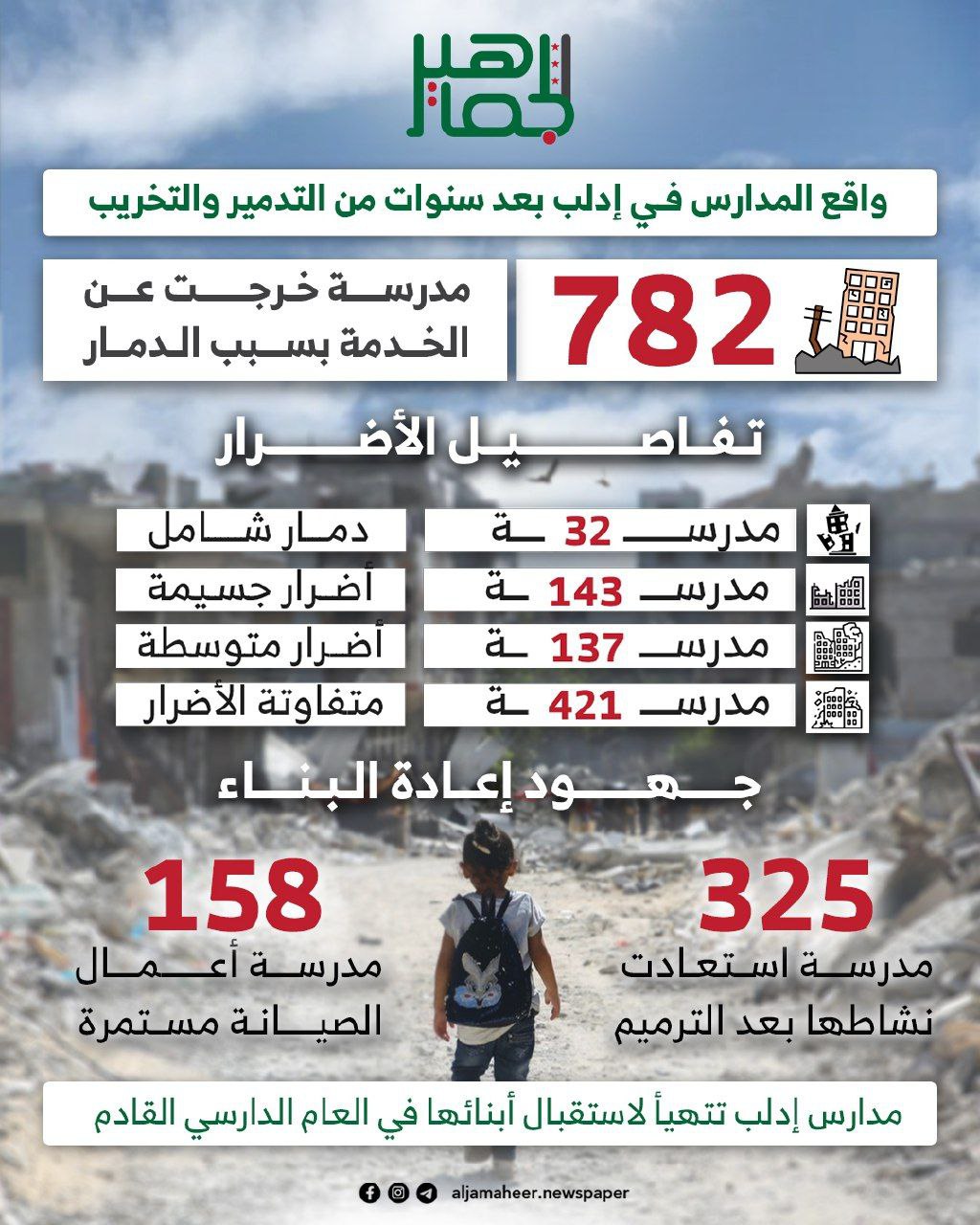نحو 782 مدرسة خرجت عن الخدمة بعد تدميرها مدارس إدلب بالأرقام قبل بداية العام الدراسي عين الجماهير On أغسطس 26, 2025 Share #صحيفة_الجماهير Share FacebookTwitterGoogle+ReddItWhatsAppPinterestالبريد الإلكتروني