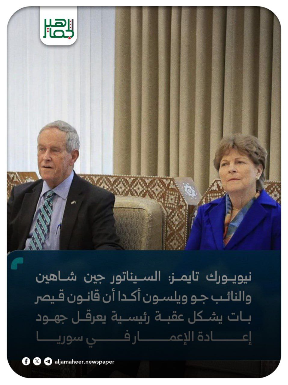 📌السيناتور جين شاهين العضو الديمقراطي البارز في لجنة العلاقات الخارجية والنائب الجمهوري جو ويلسون زارا سورية للمطالبة بإلغاء دائم للعقوبات الأمريكية التي أكدا أنها تعيق تعافي البلاد