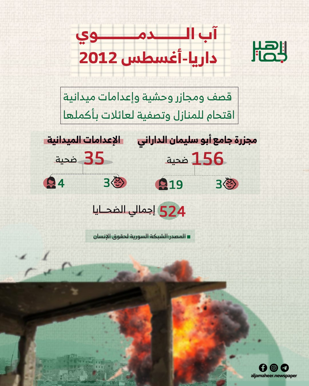 524 ضحية في آب الدموي ذكرى مجـ.ـــازر داريا في آب 2012 أحدث الأخبار On أغسطس 27, 2025 Share Share FacebookTwitterGoogle+ReddItWhatsAppPinterestالبريد الإلكتروني
