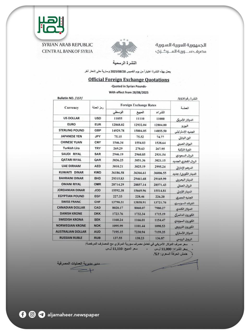 سعر صرف الليرة السورية مقابل العملات الأجنبية والعربية بحسب النشرة الرسمية من مصرف سورية المركزي بتاريخ 28/ 08/ 2025 اقتصاد On أغسطس 28, 2025 Share #صحيفة_الجماهير Share FacebookTwitterGoogle+ReddItWhatsAppPinterestالبريد الإلكتروني