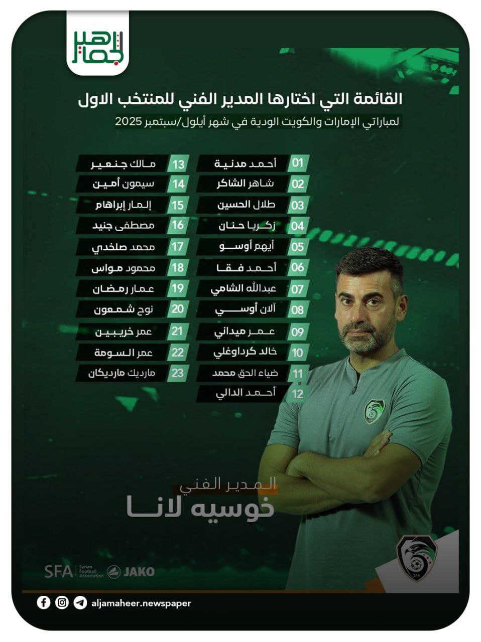 قائمة المنتخب الوطني الأول لمباراتي الإمارات والكويت الودية التي اختارها المدير الفني لشهر أيلول القادم رياضة On أغسطس 28, 2025 Share Share FacebookTwitterGoogle+ReddItWhatsAppPinterestالبريد الإلكتروني