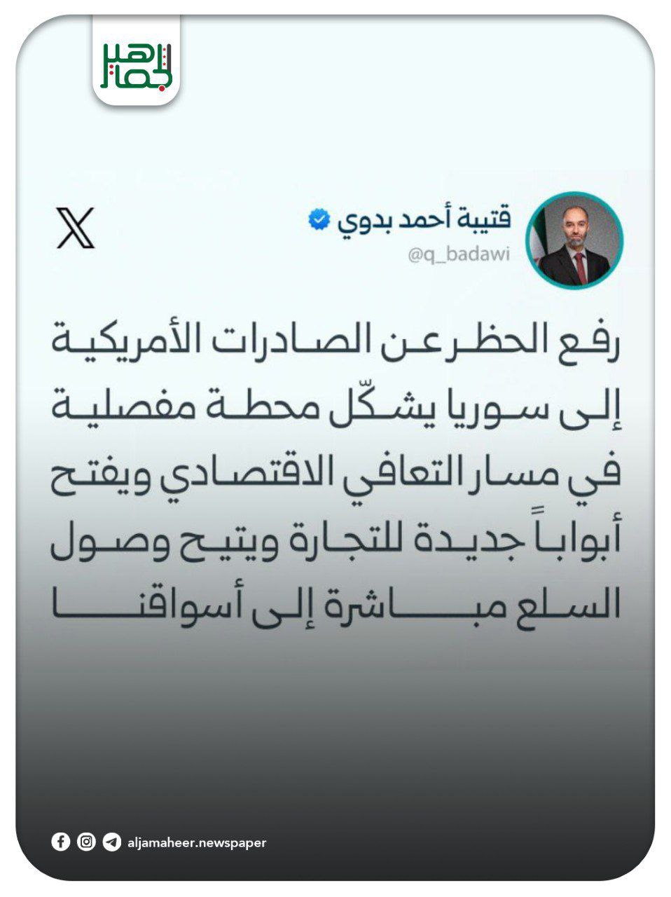 📌 رفع الحظر عن الصادرات الأمريكية إلى سورية يشكّل محطة مفصلية في مسار التعافي الاقتصادي.