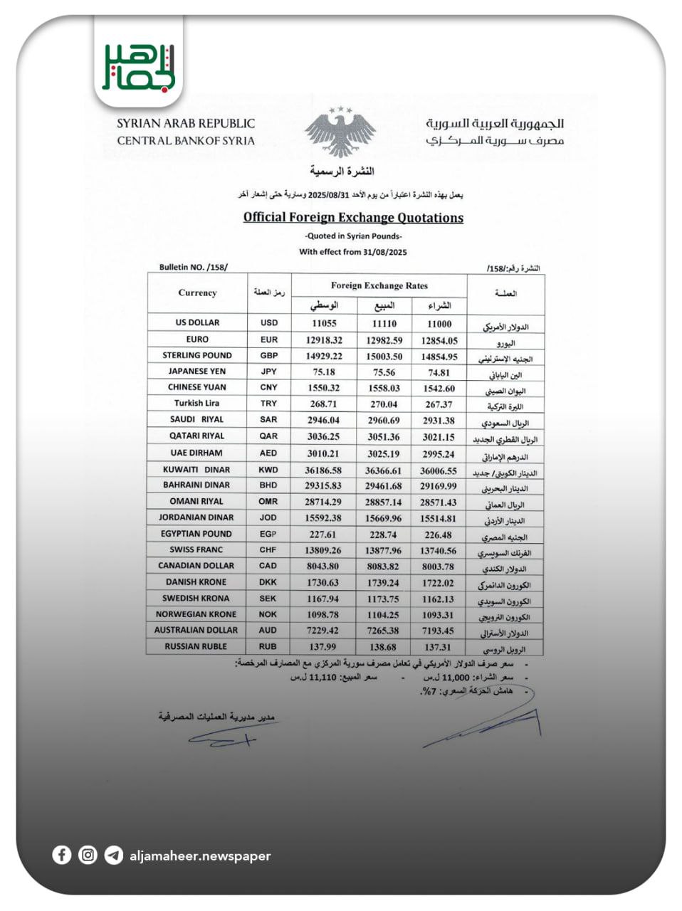 سعر صرف الليرة السورية مقابل العملات الأجنبية والعربية بحسب النشرة الرسمية من مصرف سورية المركزي بتاريخ 31/ 08/ 2025 اقتصاد On أغسطس 31, 2025 Share #صحيفة_الجماهير Share FacebookTwitterGoogle+ReddItWhatsAppPinterestالبريد الإلكتروني
