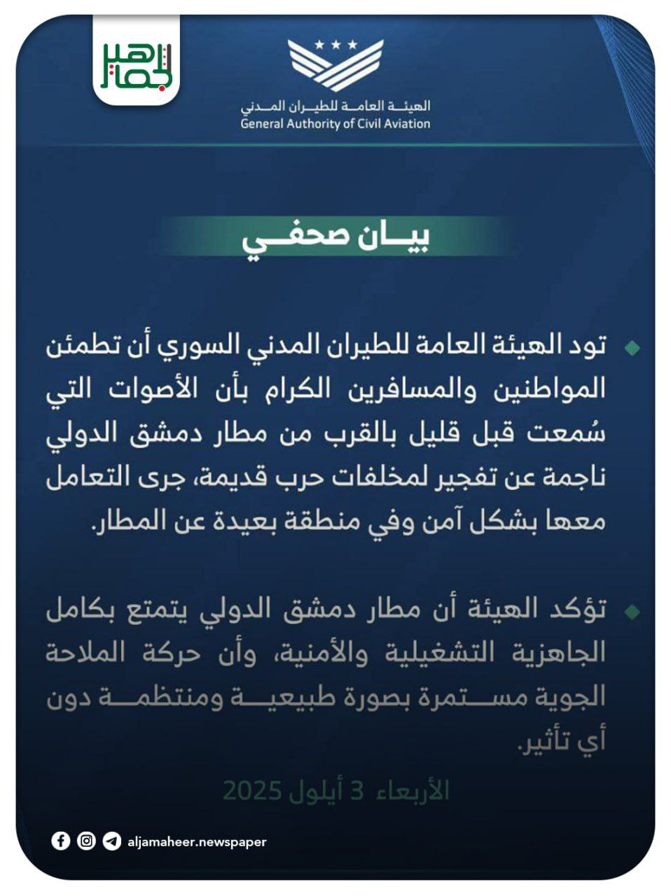 الهيئة العامة للطيران المدني السوري:الأصوات التي سمعت في محيط مطار دمشق الدولي ناجمة عن تفـجير مخلفات حــرب بمنطقة تبعد أكثر من 20 كيلو متراً عن المطار أحدث الأخبار On سبتمبر 3, 2025 Share 📌 حركة الملاحة الجوية تسير بشكل طبيعي والأوضاع آمنة في المطار. Share FacebookTwitterGoogle+ReddItWhatsAppPinterestالبريد الإلكتروني