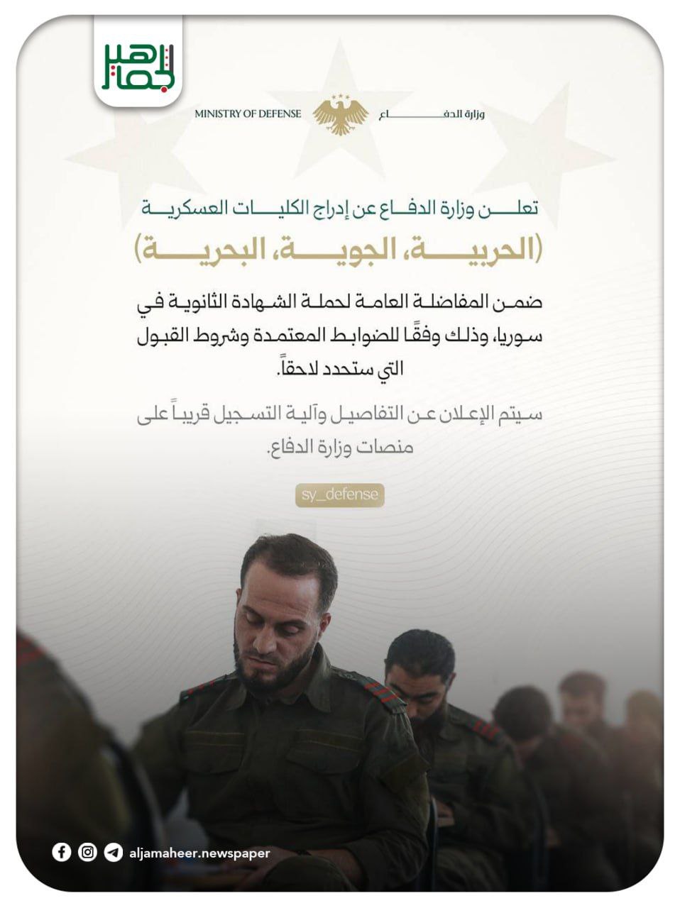 تعلن وزارة الدفاع عن إدراج الكليات العسكرية (الحربية، الجوية، البحرية) ضمن المفاضلة العامة لحملة الشهادة الثانوية في سورية