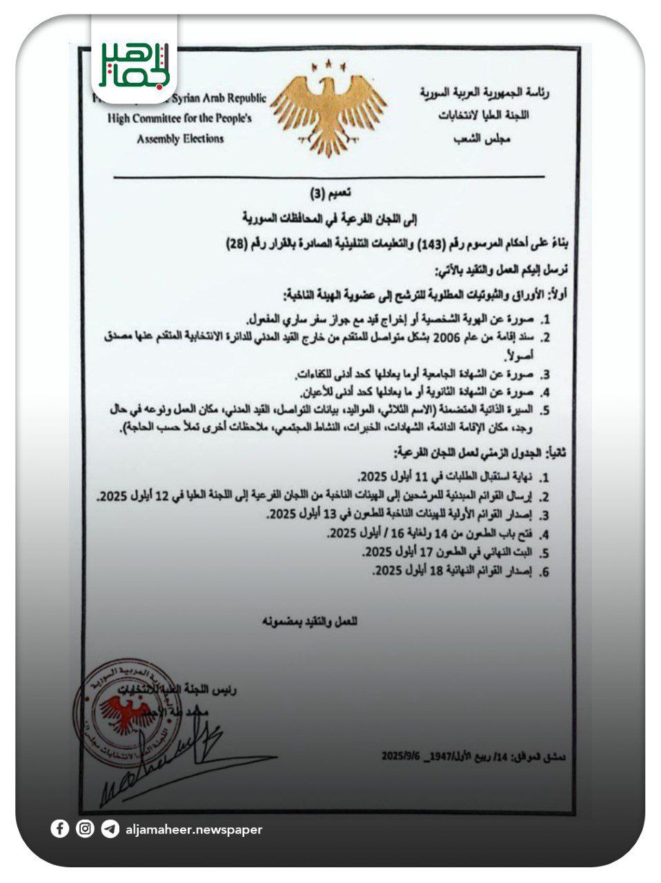 اللجنة العليا لانتخابات مجلس الشعب تُصدر التعميم رقم /3/ لعام 2025 المتضمن الأوراق والثبوتيات المطلوبة للترشح لعضوية الهيئات الناخبة. أحدث الأخبار On سبتمبر 8, 2025 Share Share FacebookTwitterGoogle+ReddItWhatsAppPinterestالبريد الإلكتروني