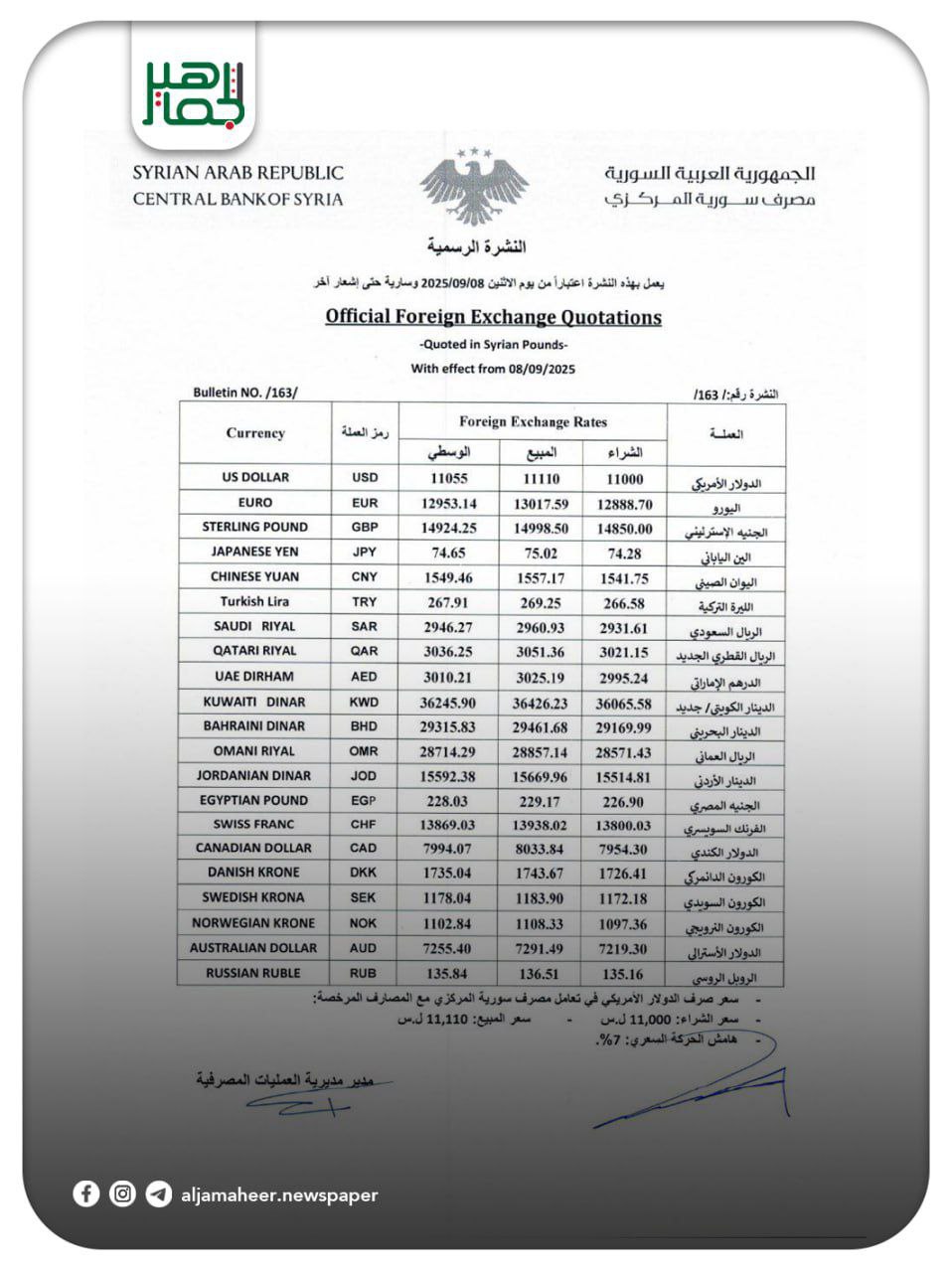 سعر صرف الليرة السورية مقابل العملات الأجنبية والعربية بحسب النشرة الرسمية من مصرف سورية المركزي بتاريخ 8/ 9/ 2025 اقتصاد On سبتمبر 8, 2025 Share #صحيفة_الجماهير Share FacebookTwitterGoogle+ReddItWhatsAppPinterestالبريد الإلكتروني