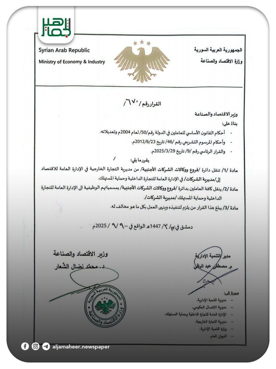 أصدرت وزارة الاقتصاد والصناعة قراراً بنقل دائرة فروع ووكالات الشركات الأجنبية من مديرية التجارة الخارجية في الإدارة العامة للاقتصاد إلى مديرية الشركات في الإدارة العامة للتجارة الداخلية. اقتصاد On سبتمبر 9, 2025 Share #صحيفة_الجماهير Share FacebookTwitterGoogle+ReddItWhatsAppPinterestالبريد الإلكتروني